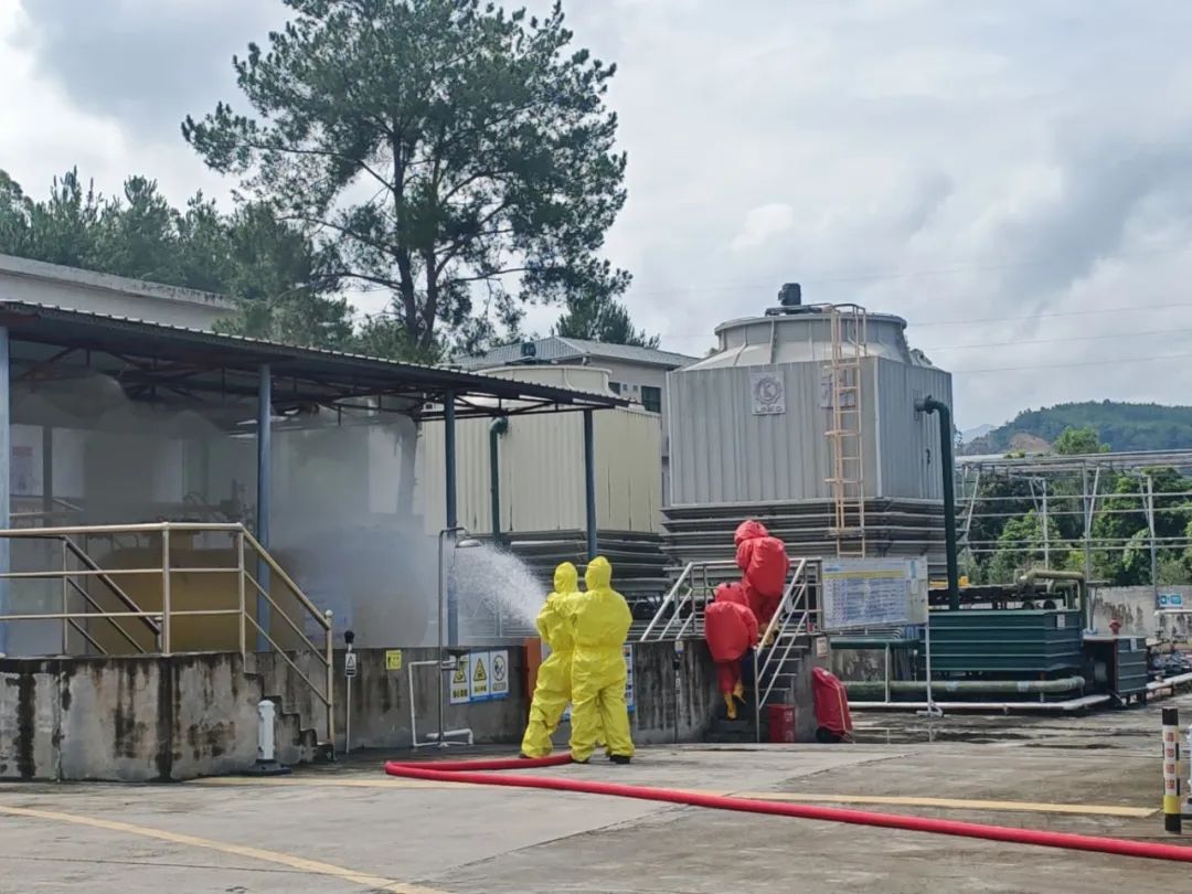 接報后,縣應(yīng)急管理局立即組織相關(guān)人員進行分析研判,向各相關(guān)部門發(fā)布預(yù)警信息,同時啟動危化品生產(chǎn)安全事故IV級應(yīng)急響應(yīng)并趕赴現(xiàn)場成立臨時指揮部??h消防救援大隊3輛消防車率先抵達,消防員利用泡沫槍、干粉槍等消防裝備進行滅火和隔離、稀釋泄漏物;縣醫(yī)療救護組同步跟進,在現(xiàn)場設(shè)立臨時救治點,演練中毒人員急救轉(zhuǎn)運;縣應(yīng)急管理局高效履職,及時對物資進行調(diào)配;縣公安局和文福鎮(zhèn)迅速實施交通管制和群眾疏散;縣生態(tài)環(huán)境局監(jiān)測人員快速布設(shè)監(jiān)測點位,實時監(jiān)控空氣質(zhì)量;氣象部門提供精準(zhǔn)風(fēng)向風(fēng)速數(shù)據(jù),為救援決策提供支持。各部門在指揮部的統(tǒng)一調(diào)度下快速響應(yīng)、密切配合。